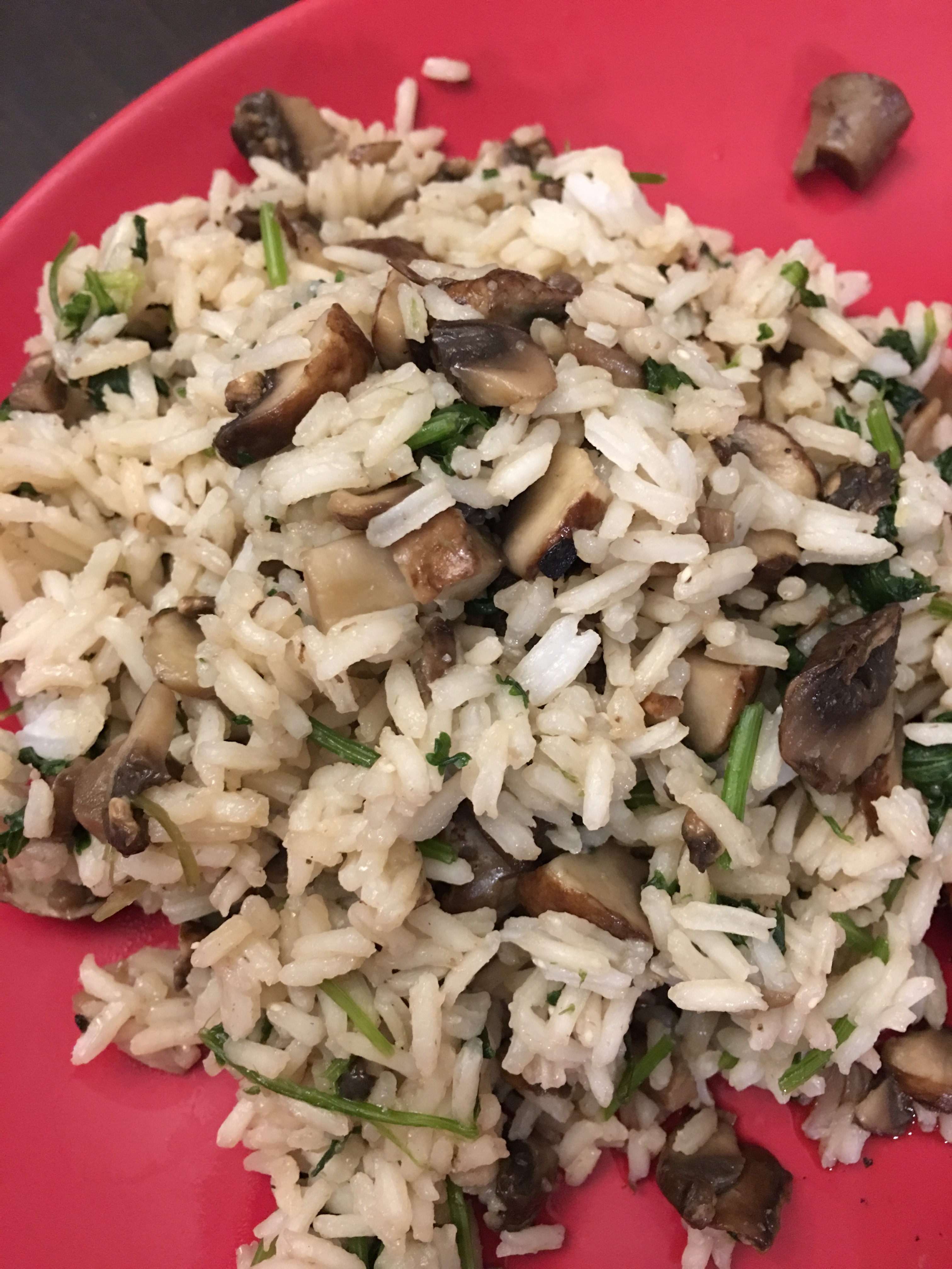 Rinse the white rice until the water becomes clear. It is always good to get organic white rice because of the arsenic that has been known to be in white rice. Cook the rice, cover and Sautee chopped mushrooms and cilantro together in a little bit of water (half cup), the juices from the mushrooms usually creates more water. Cook on a medium low heat, as you see the mushrooms start to soften and shrink add garlic salt. I usually put a few shakes, then I stir it, let is sit for about 5 more minutes, then I will taste it and usually add a few more shakes. It is basically to your liking taste. Don’t over due it though because it can turn too salty real quick. Add the rice to the mushrooms and cilantro, mix it in real good and serve.