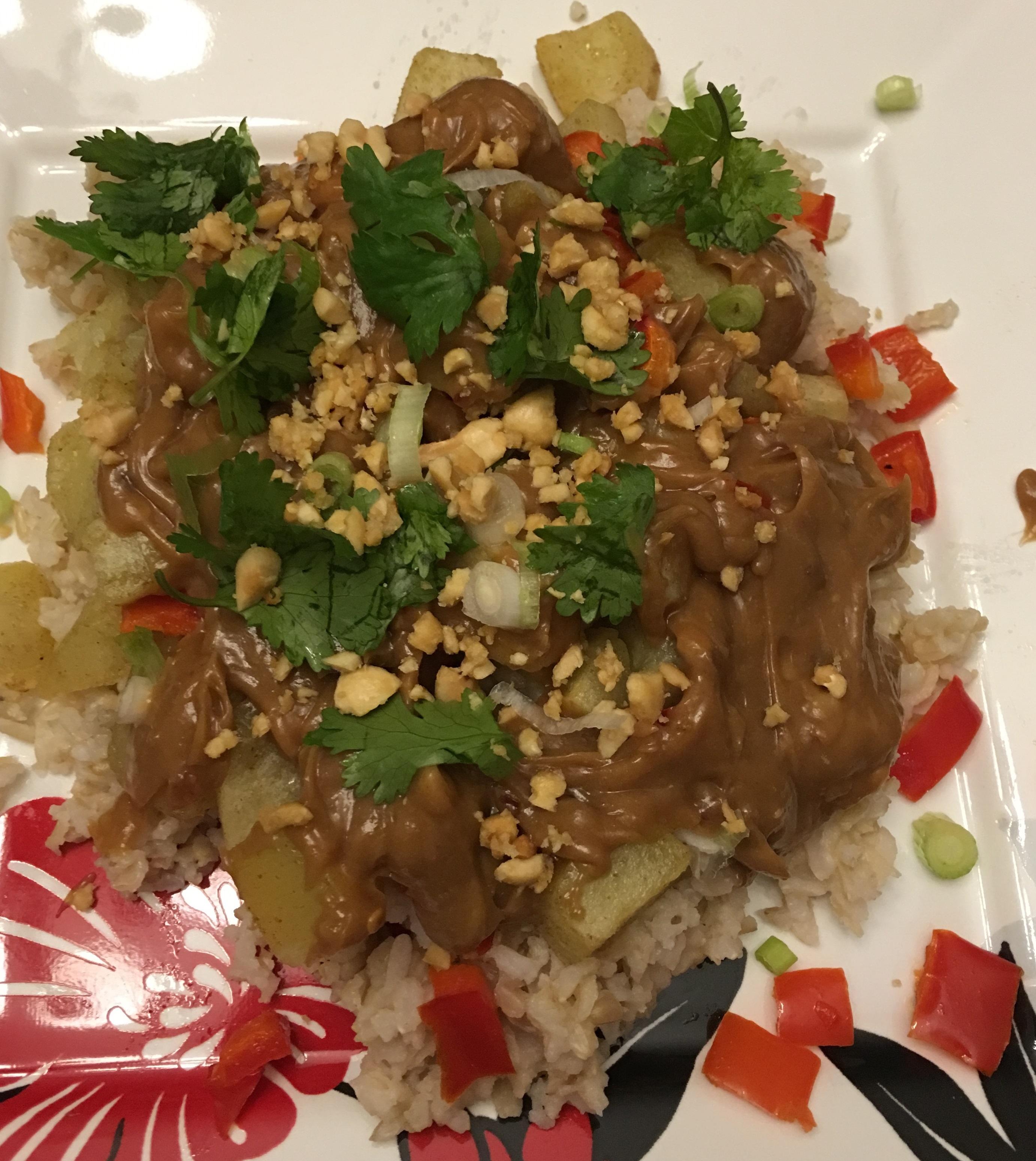This is a delicious dish, I changed it up a bit from the original recipe. It’s a Bold and spicy Thai peanut sauce drizzled over roasted sweet potatoes and bell peppers on a bed of rice. The sauce would also be great on stir-fries and salads, or as a dip for raw vegetables. This is a healthy vegetarian, vegan and gluten-free recipe.
