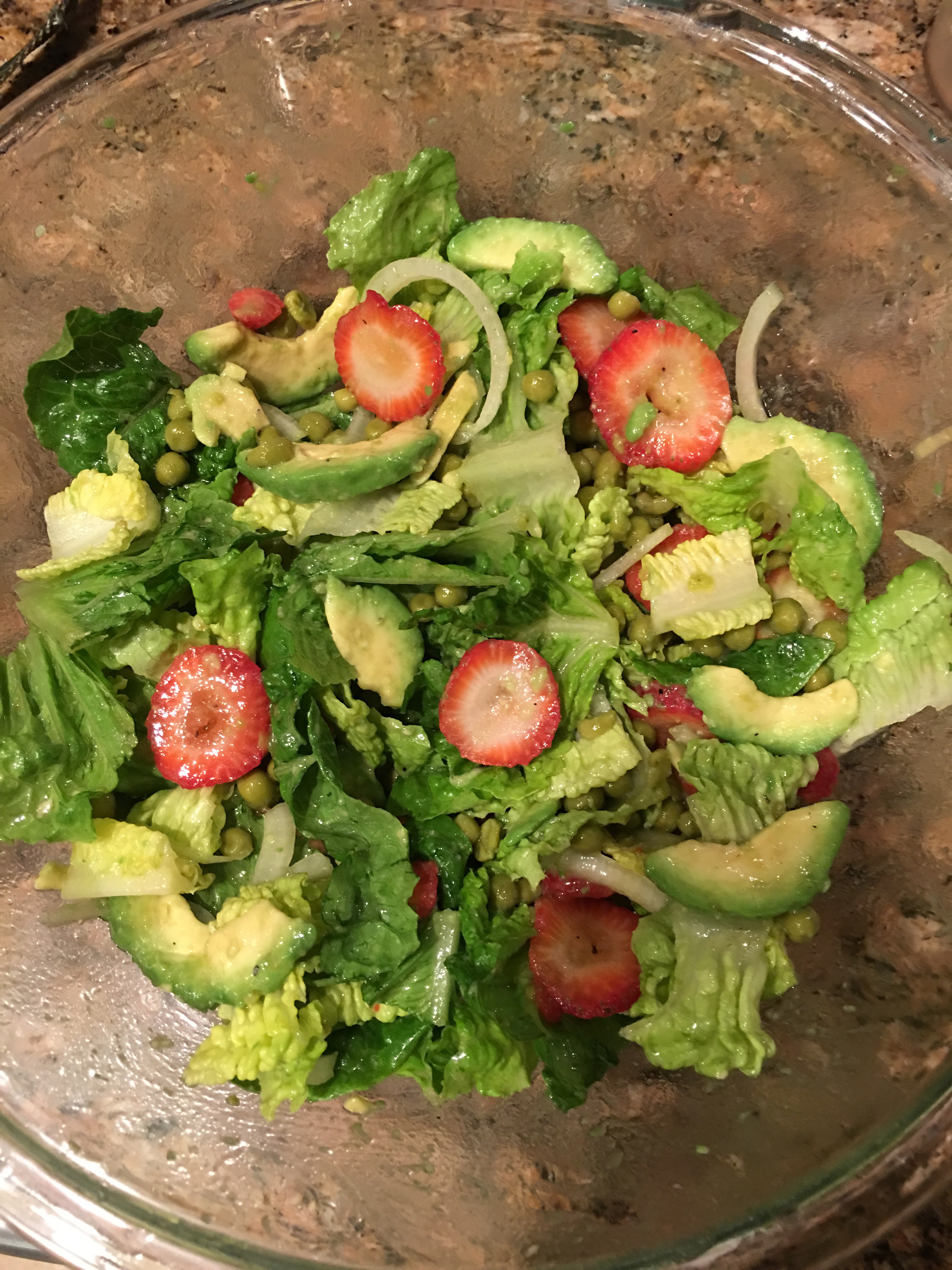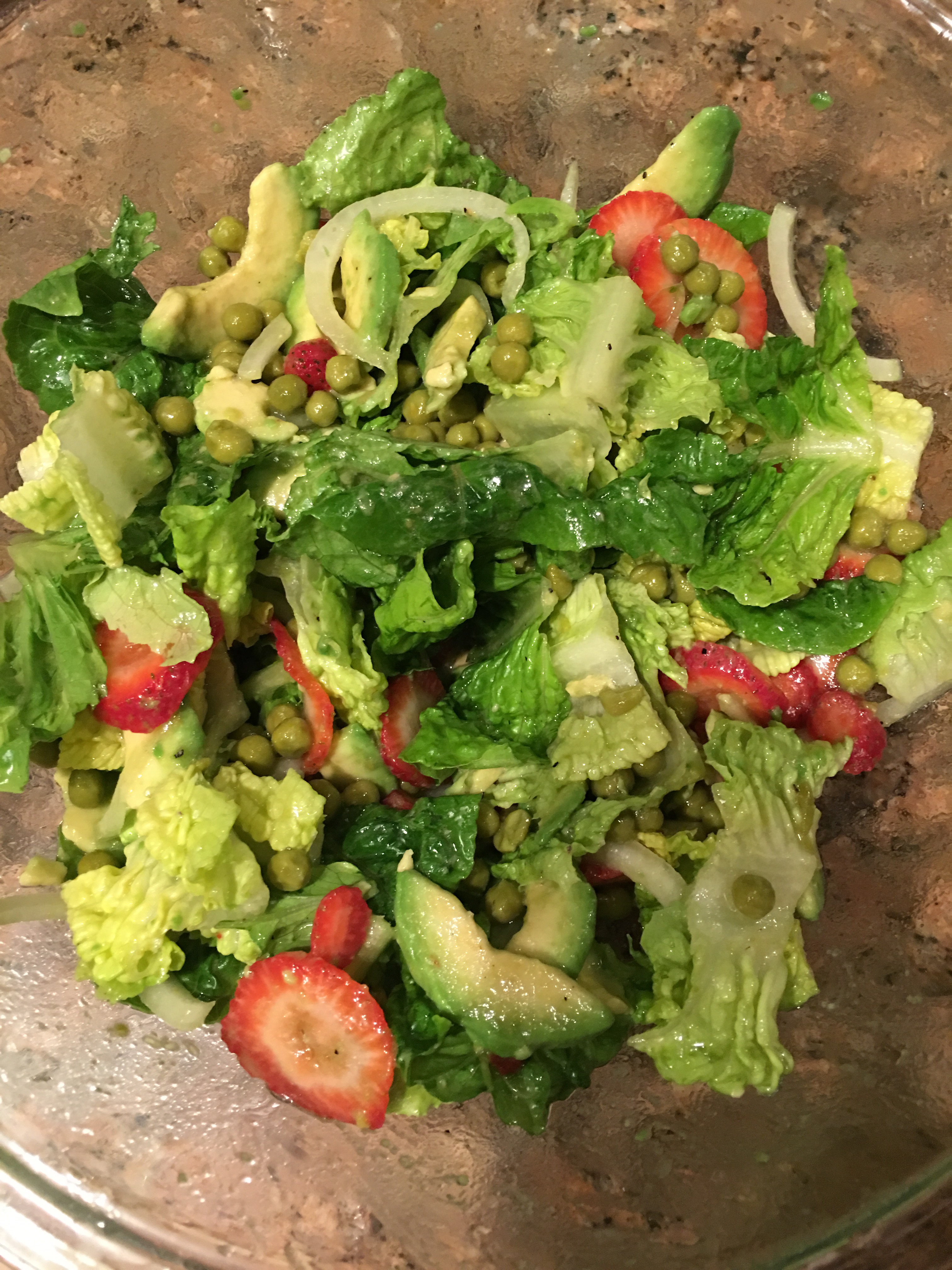 - Place romaine lettuce in a large bowl and top with strawberries, peas, avocado, and onion. Drizzle with the dressing. Toss and serve.